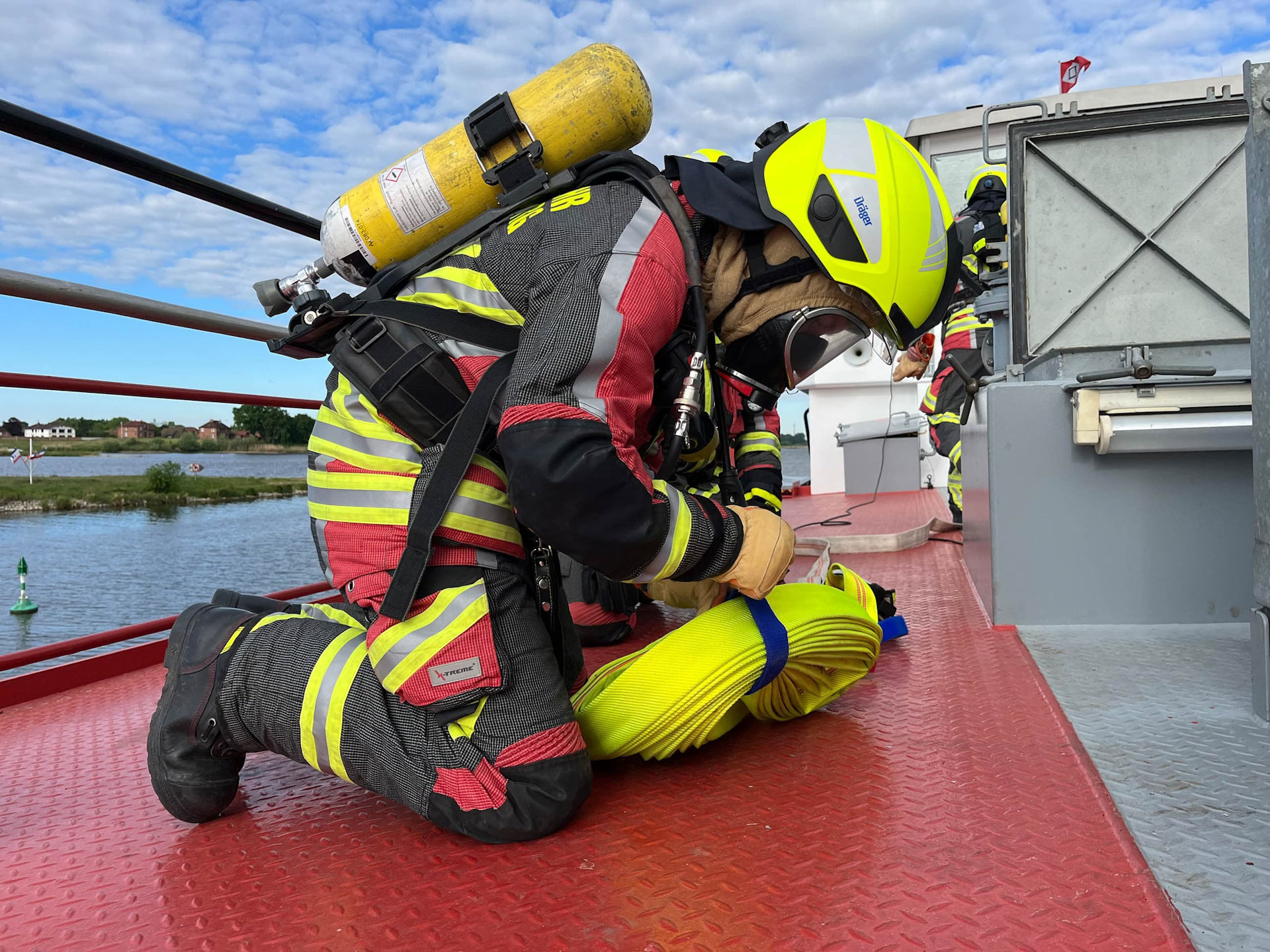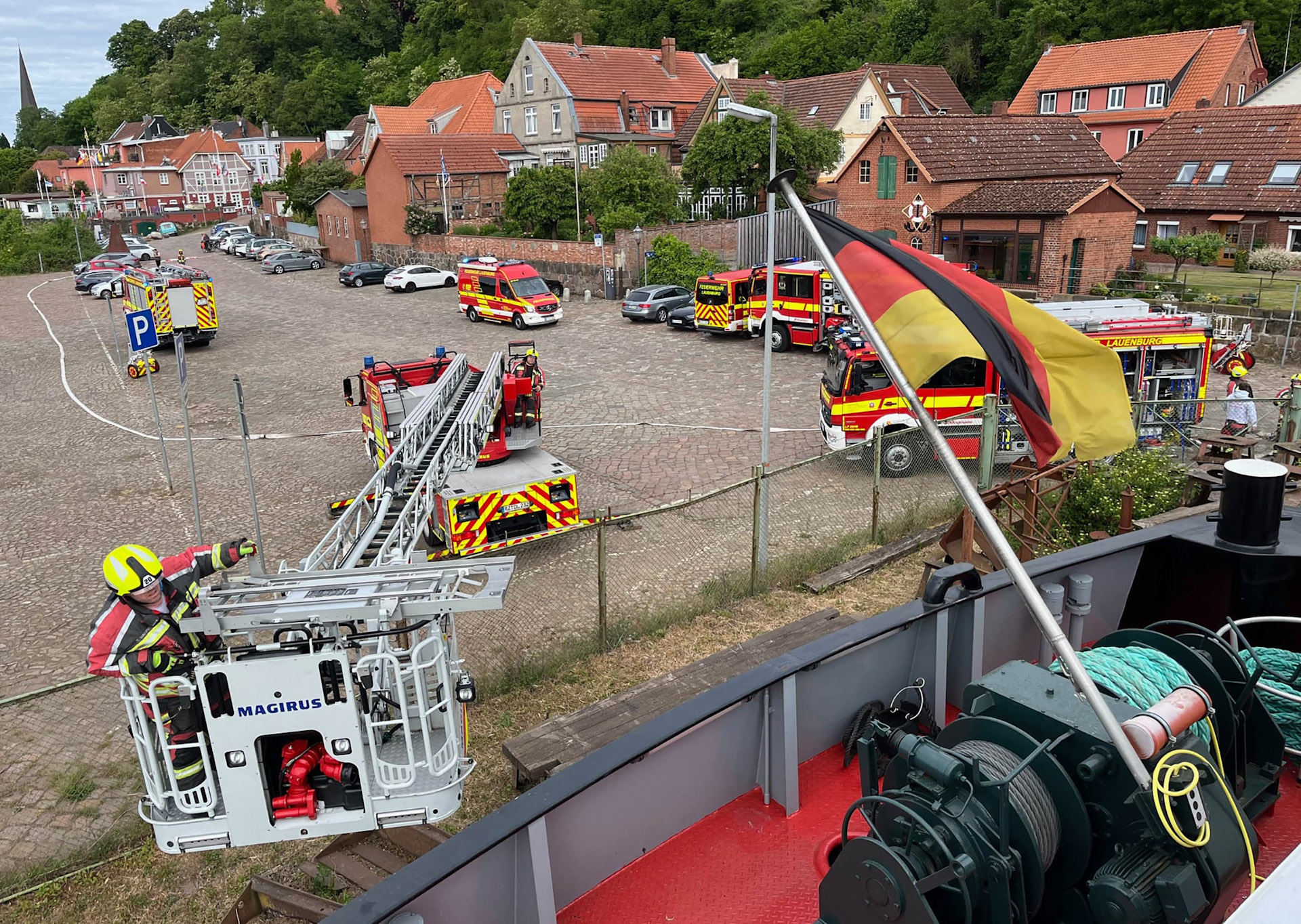 Mit dem Stichwort „Feuer Schiff“ wurde die Feuerwehr Lauenburg und Schnakenbek am Samstagmorgen in den Bereich der Hitzler Werft alarmiert. Auf einem Tankschiff kam es bei Schweißarbeiten zur Verpuffung. Noch während der Anfahrt informierte die Rettungsleitstelle die anrückenden Kräfte über zwei vermisste Personen und erhöhte so das Stichwort auf „Feuer Y – Menschenleben in Gefahr“. Da der Einsatz gerade auf Tankschiffen immer etwas besonderes ist, gerade auch durch die engen Luken, ging der erste Angriffstrupp vom LF20 zu dritt in das innere des Schiffes vor. Es folgten im Laufe des Einsatzes weitere Atemschutzträger, zusätzlich auch durch die Feuerwehr Hohnstorf, die zusätzlich nachalarmiert wurde. Während einige die Brandbekämpfung übernahmen, kümmerten sich andere um die Menschenrettung aus dem engen Schiffstank. Hierfür wurden Schleifkorbtragen und Leiterböcke verwendet. Nach ca. einer Stunde konnte „Feuer aus“ gegeben werden, so wie, dass alle Personen erfolgreich gerettet wurden. Im Anschluss wurde eine Nachbesprechung durchgeführt. Alle waren sich einig, dass es eine gelungene unangekündigte Alarmübung war. An dieser Stelle auch nochmal ein Dank an die Dettmer Reederei, die das Tankschiff als Übungsobjekt zur Verfügung stellte.